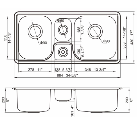 槽底采用斜面壓痕,四輻導(dǎo)流槽設(shè)計(jì),與平面壓痕和無痕水槽相比,導(dǎo)水更為流暢,下水更迅速,能有效防止積水,消除沉淀物