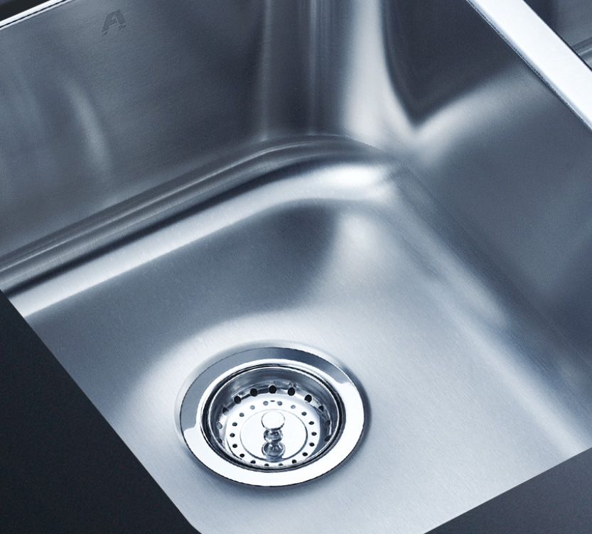 阿發水槽整體經拉絲處理,質地更加光滑,視覺更加柔和。能有效抵擋異物撞擊,刮傷及磨損,防止油污沾染,常用常新;柔和的光澤令水槽平添高雅氣質,更能避免鏡面材質反射的光污染